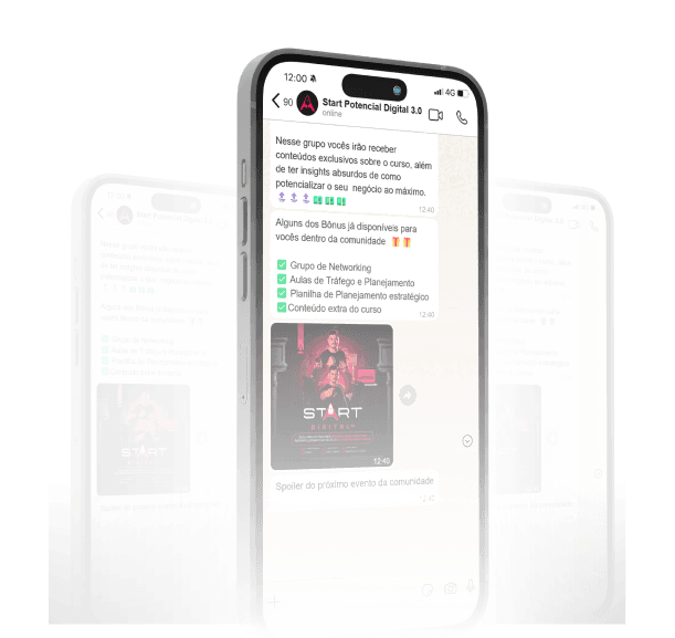 Você terá acesso às aulas gravadas, para assistir no seu ritmo, e também a encontros ao vivo comigo e com outros empresários que estão no campo de batalha. O Start Potencial Digital é feito por quem empreende, para quem empreende.